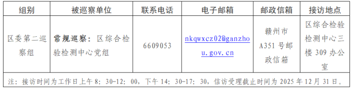 根据区委统一部署,区委第二巡察组于2025年11月11日至2026年1月8日对区综合检验检测中心党组开展常规巡察。区委巡察组重点关注学习贯彻党的二十大、二十届三中全会精神和习近平总书记考察江西重要讲话精神,落实省委打造“三大高地”、实施“五大战略”,市委锚定“四个定位”、实现“六个突破”、强化“两个保障”发展思路和区委“大区挑大梁、争当排头兵”工作目标,以及深化整治群众身边不正之风和腐败问题等情况,紧盯被巡察单位职能作用发挥和权力运行,深入查找并纠正政治偏差。现将有关事项公告如下: